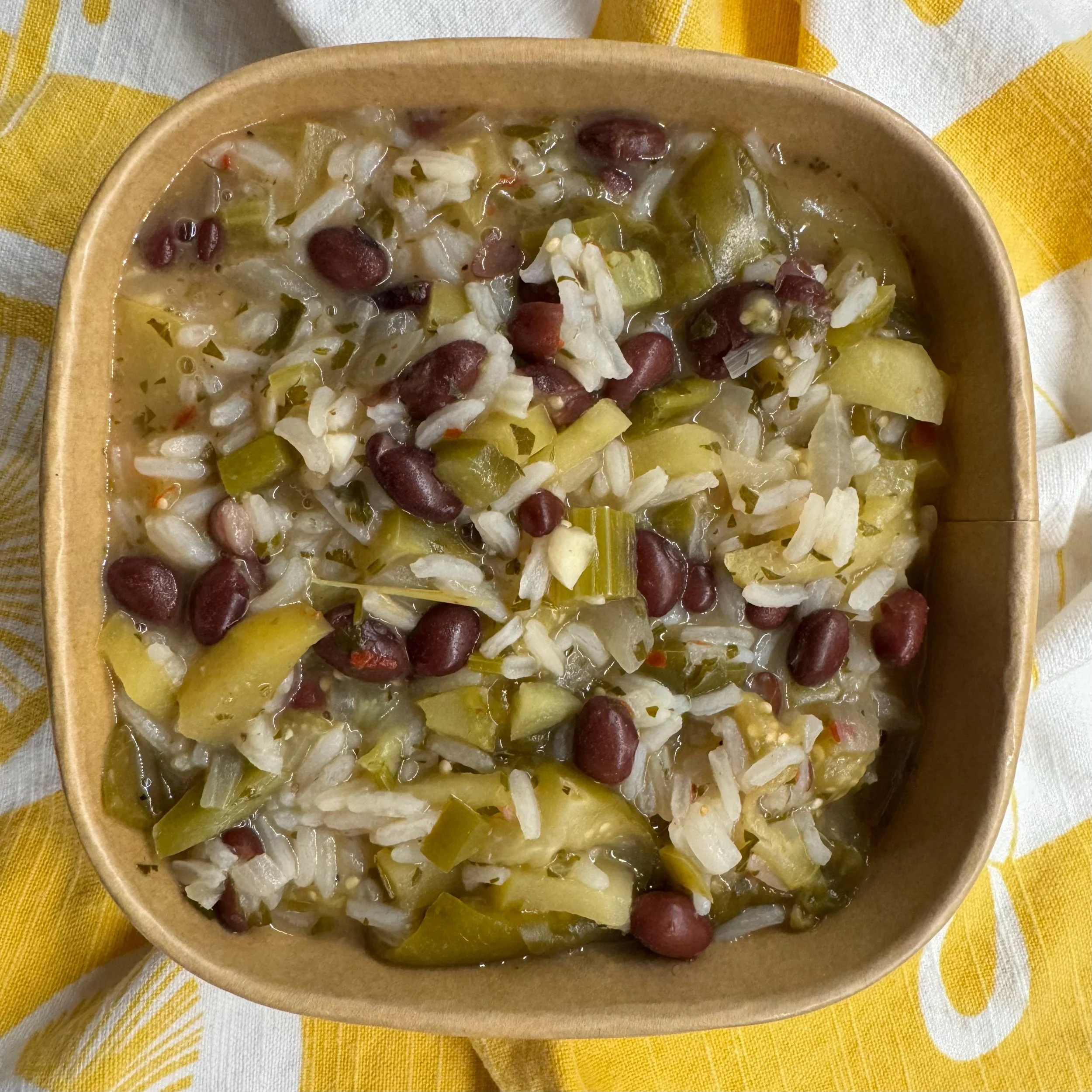 A bright, tangy, slow-simmered green chili packed with layered flavor. Onions, celery, pasilla and jalapeño peppers, tomatillos, garlic, and tart green apples cook down into a vibrant verde sauce seasoned with chipotle flakes, and black pepper. Fresh cilantro adds a final herbal lift, while hearty black beans and fluffy rice make the dish filling, balanced, and deeply comforting.